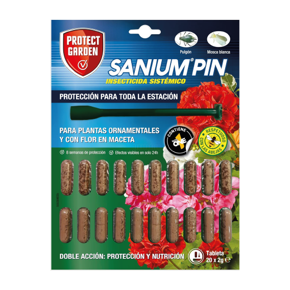 Sanium Pin ofrece la combinación del insecticida de última generación Flupiradifurona con un contenido adicional de abono NutriOne, ofrece una protección estable y duradera frente a ataques de insectos, además de un aporte continuado de nutrientes durante 3 meses.