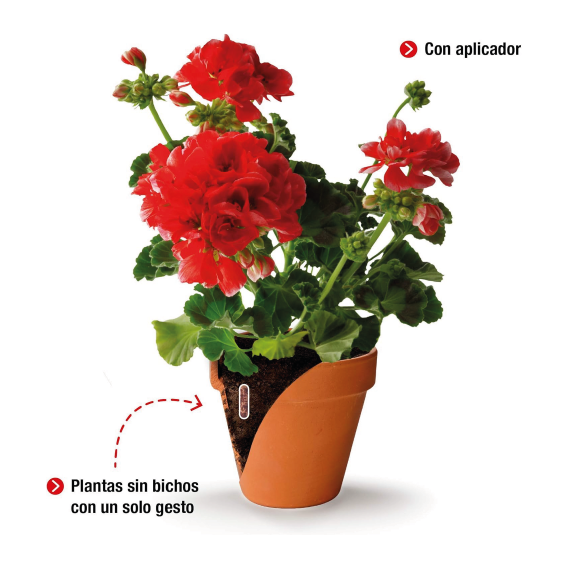 - Elimina insectos dañinos como pulgones, mosca blanca y hormigas, protegiendo las plantas desde el interior.